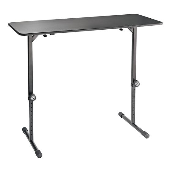 Professional DJ desk for stationary and mobile use. The spacious tabletop with dimensions of 1,100 x 455 mm provides room for a wide range of studio and DJ equipment. Thanks to the four quick-release clamps, the tabletop can be mounted or removed quickly and easily. The robust frame made of steel tubes provides the necessary stability. In addition, an adjustable end cap guarantees a wobble-free stand. The height can be adjusted in 30 mm steps from 605 to 1,055 mm by means of spring-loaded locking bolts. For mobile use, the two base frames and the support tubes can be dismantled and, together with the frame and the top, offer a flat and user-friendly package.