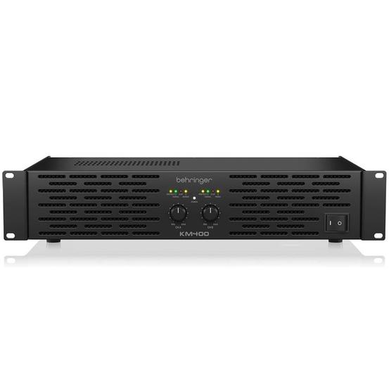 The Behringer KM400 is a versatile stereo power amplifier designed for live sound, studio, and installed audio systems. It delivers clear, punchy output with plenty of headroom, making it suitable for a wide range of speaker setups. With flexible power options for 4–ohm and 8–ohm operation, as well as bridge mode for higher output, the KM400 adapts easily to different configurations. Built–in protection circuitry helps safeguard your system, while front–panel LEDs provide quick visual monitoring. Balanced XLR inputs, secure twist–lock speaker outputs, and efficient front–to–back cooling are all housed in a rugged 2U steel chassis.