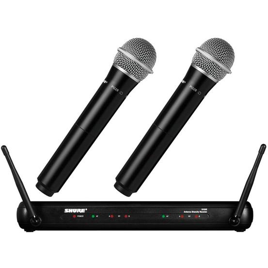 The Shure SVX288PG28 Dual Wireless Handset Mic System includes the SVX88 Dual Diversity Receiver, and two PG28 Handheld Microphone Transmitters. This is a perfectly matched package of Shure products - great for vocalists, MCs and announcers.