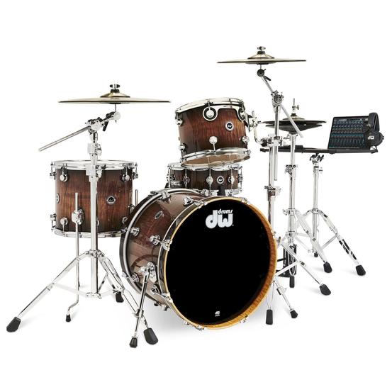 The DW DWe 4–Piece Shell Pack with Cymbals & Hardware in Exotic Curly Maple Finish represents the world's first acoustic and electronic convertible drum set featuring wireless technology. This innovative kit blends authentic DW shells with cutting–edge electronics, allowing musicians to play as either a Pure Maple acoustic drum set or as a completely wireless electronic kit. The fast and easy drumhead switch enables seamless conversion from legendary acoustic tones to expressive digital sounds, while the included electronic drumheads use wireless connections to translate percussive signals into chosen instrument sounds with quick, low–latency firing.