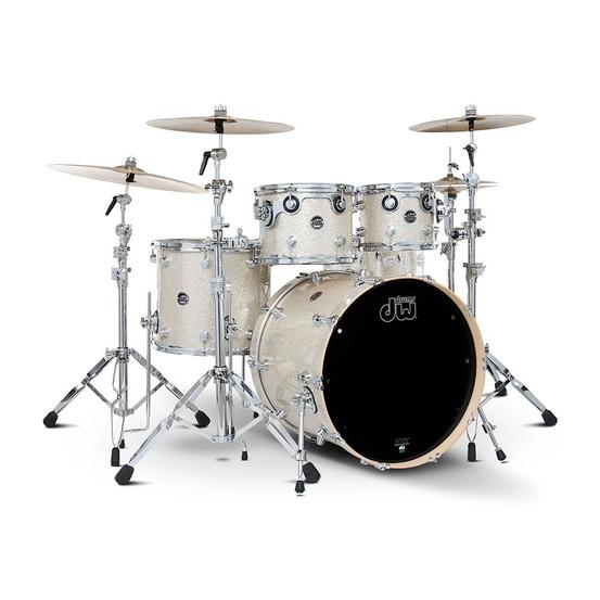 Toms and bass drum are built from 8 plies of Hard Rock Maple with 45-degree/60-degree back-cut bearing edges, while snares feature 10 plies with a 45-degree edge for added cut and projection. Performance Series drums share many hardware details with the Collectors Series, including Suspended Tom Mounts (STM), quarter-sized turret lugs, and triple-flange graduated counter hoops. Bass drums come with matching maple hoops and low-mass claw hooks, while all drums include DWs True-Pitch tension rods for precise tuning.