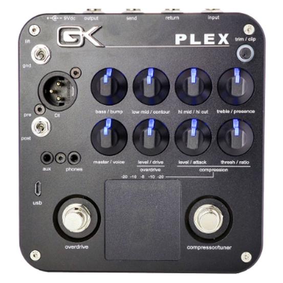 The Plex preamp combines 47 years of amp design experience with state of the art technology to deliver the flexibility today's musicians require. The heart of every GK product is the active 4 band “variable Q” equaliser and contour circuit that set the standard for bass tone shaping over 30 years ago. Building on this proven foundation, the PLEX features expanded filter options that allow you to further dial in your instruments unique voice. Foot switchable Compressor and Overdrive ensure your performance blends seamlessly into the band or cuts through a crowded mix and the Chromatic Tuner makes sure it’s all in tune. The ¼” output drives the front of your instrument amp or power amplifier while the DI output sends it all to the PA or recording console. Aux IN and Phones Out make the PLEX ideal for jamming along silently with your favourite tunes and the USB input/output allows pristine digital recording and re-amping capability when used with your favourite recording software.