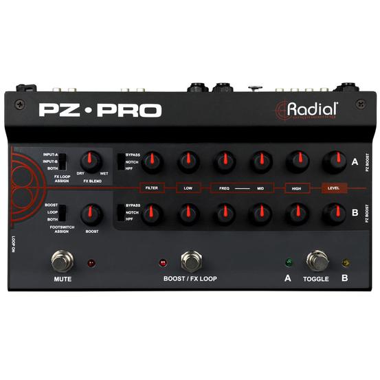 The PZ-Pro is highly configurable, so you can adapt it to meet the needs of your performance, instead of changing your performance to fit the limitations of your gear. Connect magnetic pickups, instruments with on-board preamps, or piezo transducers, and optimise the sound of each with powerful EQ controls and a variable notch or high-pass filter. Blend an instrument mic with your pickups, switch between two instruments, or connect a vocal microphone and feed it through your guitar pedals.