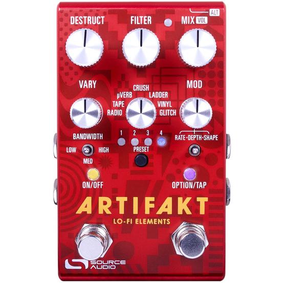 The Artifakt Lo-fi Elements is the first pedal of its kind, a comprehensive collection of all the hazy, scratchy, wobbly, and broken tones that epitomize the term 'lo-fi'." Like a mega-delay or mega-reverb, Artifakt is a “one-stop shop” for all the most sought-after lo-fi effects including old vinyl replications, tape modulation and saturation, bit crushing, sample rate reduction, dark reverb and echo, filtering, compression, glitch, and more.