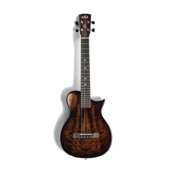 Construction centres on a 17.1875–inch scale length with 22 frets and a Florentine cutaway that accommodates higher–fret access. The body measures 12.375 inches long with a shallow 1.375–inch depth, keeping weight minimal without sacrificing resonance. Active electronics employ a passive piezo pickup system suitable for live performance and recording capture. White pearl oval fret markers provide clear position reference across the 1.4375–inch nut width, expanding to 1.75 inches at the neck–body joint. The instrument ships with a padded Revelator Transit Series gig bag and Kala's proprietary string set.