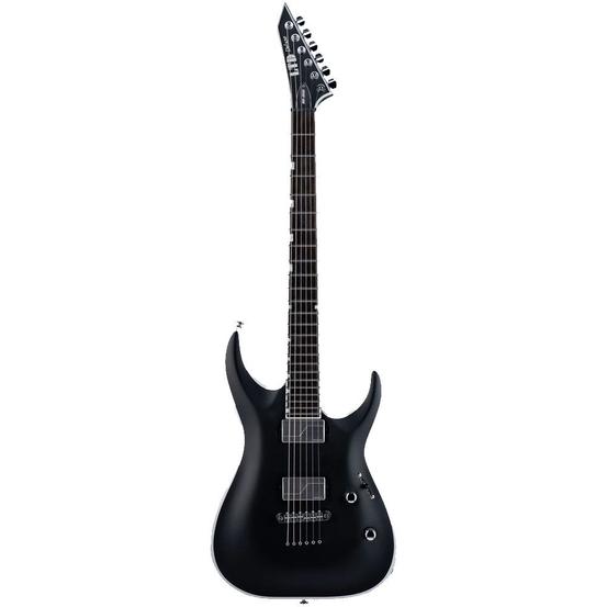 The LTD Deluxe MH-1000NT Bold Binding, in an elegant Black Satin finish, stands out with its double-thick silver painted binding on the body and headstock. Built with set-thru construction at a 25.5” scale, it features a mahogany body with a maple cap, offering a rich, balanced tone and striking visual appeal.
