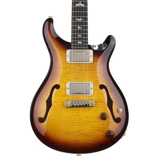 With brilliant acoustics and a vast array of tones, the Hollowbody II has been a constant favourite in our dynamic lineup of semi-hollow instruments. The combination of the maple top and back with mahogany sides provides tonal clarity and extraordinary resonance.FeaturesMahogany bodyCarved figured maple topFully-Hollow with Double F-HolesMahogany neckRosewood fretboardPRS adjustable stoptail bridge, PiezoPRS Phase III locking tunersNickel hardwareDual 58/15 LT pickups3-Way toggle pickup selector22 frets25" scaleBird fretboard inlays