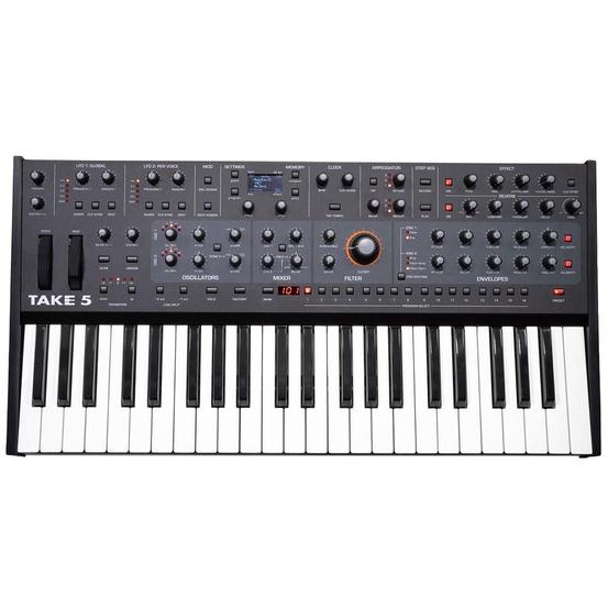 With 44-full-size keys and a total width of just 26 inches, the Take 5 fits easily into your studio or on stage. Its nearly knob-per-function control panel gives you immediate access to all of its essential sound-shaping controls. And its ingenious key-split feature gives you access to a wider playable range than other compact synths by letting you divide the 3.5 octave keyboard into two separate performance zones.