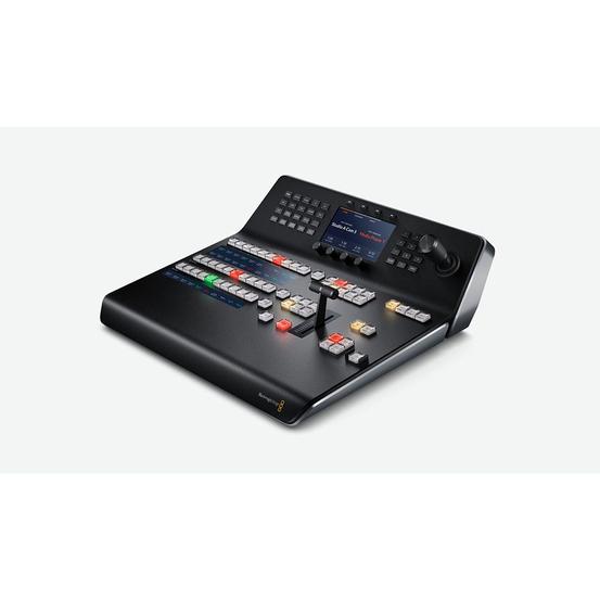 ATEM 1 M/E Advanced Panel 10 model features a single M/E row with 10 input buttons and 1 system control LCD screen with user customizable colours and label LCDs. There’s also a joystick for the DVE and T-bar fader.