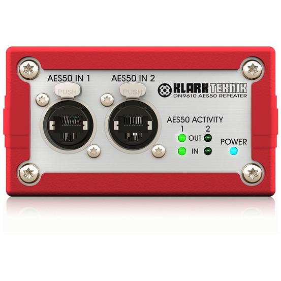 Multiple DN9610 units can be connected in series, allowing AES50 to be transmitted over considerable distances. Whilst AES50 is bidirectional in operation, to maximise ease-of-use when cascading multiple units, the two AES50 connections on DN9610 each feature a nominal input and output port to simplify reference clock distribution. Through-unit propagation delay is less than 0.5 microseconds, which has a negligible effect on overall AES50 system link latencies.