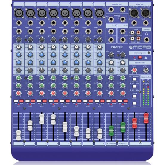 What is the secret behind DM12's superb, studio-quality sound? TheDM12 features 8 award-winning, Midas microphone preamplifiers with true +48 V Phantom Power, acclaimed by audio engineers the world over for their transparency and nuanced low noise, high-headroom design. Add to this TRS Line Inputs on all 12 channels (8 mono and 2 stereo), mono channel Inserts and 3-band EQ with mid-frequency sweep, 2 switchable pre/post-fader aux sends, 2 monitor outs, and 2-track RCA I/O, and you have an analogue work of art the fully featured DM12!
