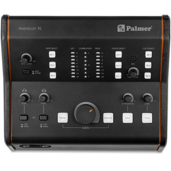 The Palmer studio monitor controller features three analog stereo inputs, one S/PDIF input and outputs for three monitor pairs, each with its own volume controller for level calibration. A further mono summed full-range output is also available for connecting either a mono monitor or a subwoofer. An exclusive highlight of the MONICON XL is its correlation meter, which displays the phase difference between a stereo signal's left and right channels. This facilitates the quick and simple discovery of mono-compatibility errors in mixes. The controller is also customisable to your personal work style.