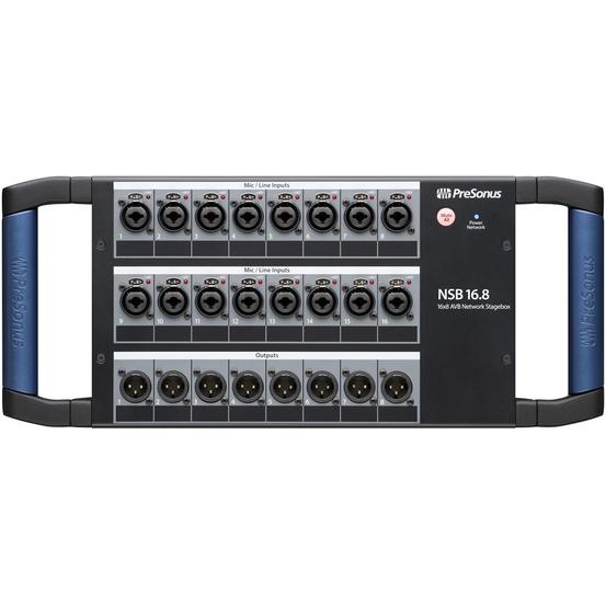 Designed to work seamlessly with PreSonus® StudioLive® Series III console/recorders the PreSonus NSB 16.8 is an 16-in, 8-out stage box that sets up quickly and easily to route signals from stage to mixer over an AVB network. With AVB networking, all signals flow through one lightweight CAT5e or CAT6 Ethernet cable, eliminating the need for a heavy, expensive copper snake—and the signal degradation that goes with long analog cable runs. You can even remote control the NSB 16.8’s inputs, preamps, and phantom power from your networked Series III console or from free PreSonus UC Surface touch-control software.