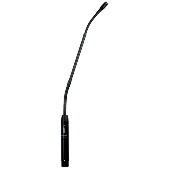 Shure Microflex® MX400 Series microphones are miniature gooseneck-mounted electret condenser microphones designed primarily for speech and vocal pickup. They can be mounted on lecterns, pulpits, or conference tables. All models include a preamplifier and are available with interchangeable cardioid, supercardioid, or omnidirectional cartridges.