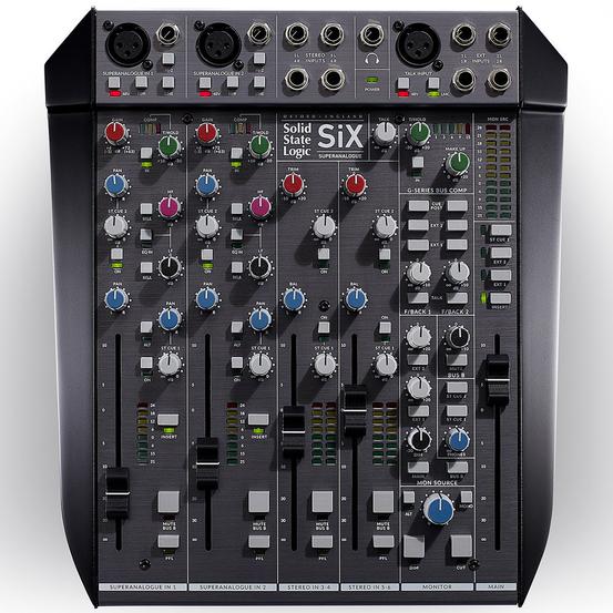 SiX is a condensed professional console for use in the studio, in post-production, on stage, and for podcasting. SiX offers big console sound and an impressive set of utility features in a format that is small enough to stick in a bag a go wherever you need it. SiX is stunning value; it offers two recording channels with SuperAnalogueTM mic pres, two band EQ, an essential one knob version of the classic SSL Channel Compressor, a new two-band Channel EQ, inserts and 100mm faders. There is a two-knob version of the legendary G-Series Bus Compressor on the main mix bus and the unique Listen Mic Compressor on the Talkback. In mixdown mode it is a very capable twelve channel summing system that offers analogue detail, depth and width to your mixes.