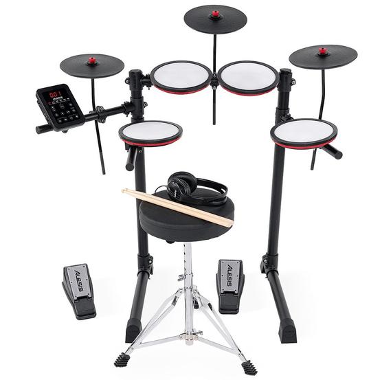 The Alesis Turbo Max is an all–in–one 7–piece electronic drum kit designed for beginners and hobbyists alike. Compact and approachable, it includes everything needed to start playing straight away — from mesh pads and pedals to a drum throne, sticks, headphones, and the feature–packed Turbo Max sound module.