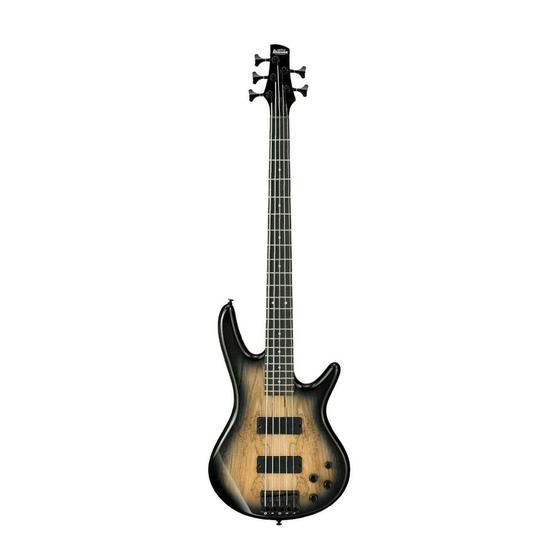 The Ibanez SR205SM NGT 5-String Bass Guitar features a spalted maple top and Phat II EQ. Its Natural Gray Burst finish and lightweight design make it a versatile choice.